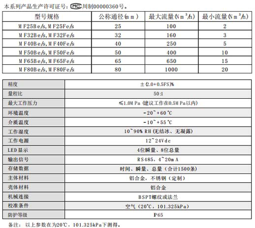 四、MF/s系列氣體質(zhì)量流量計產(chǎn)品參數(shù)