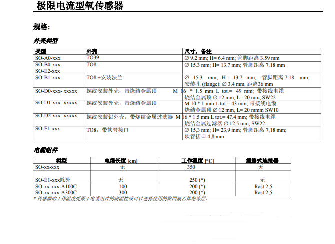 極限電流型氧化鋯氧氣傳感器SO-D2-001-A300C規(guī)格: