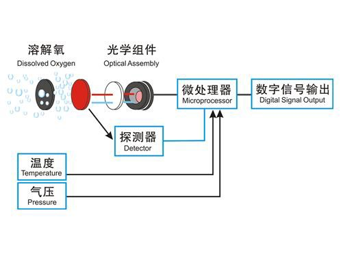 熒光法溶解氧傳感器是基于物理學(xué)中特定物質(zhì)對活性熒光的猝熄原理。來自一個(gè)發(fā)光二極管(LED)發(fā)出的藍(lán)光照射在熒光帽內(nèi)表面的熒光物質(zhì)上,內(nèi)表面的熒光物質(zhì)受到激發(fā),發(fā)出紅光,通過檢測紅光與藍(lán)光之間的相位差,并與內(nèi)部標(biāo)定值比對,從而計(jì)算出氧分子的濃度,經(jīng)過溫度和氣壓自動(dòng)補(bǔ)償輸出最終值。