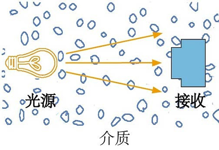 傳感器上發(fā)射器發(fā)送的光波在傳輸過程中經(jīng)過被測物的吸收、反射和散射后,有一部分透射光線能照射到 180°方向的檢測器上,有一部分散射光散射到