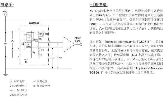NGM2611是天然氣氣體報警器的預(yù)校準(zhǔn)模塊,其精確的校準(zhǔn)功能來 自費加羅的溫度濕度控制裝置。此模塊中選用的傳感器TGS2611-E00 帶有可消除酒精這類干擾氣體的過濾器,因而對甲烷氣體的選擇性更高,響應(yīng)更快。 制造質(zhì)量可靠的民用氣體報警器的工藝中很重要的就是報警點的校準(zhǔn), 這是一個復(fù)雜而耗時的過程,還需要花費巨資購入校準(zhǔn)設(shè)備。使用此模 塊可省去這個代價高昂的校準(zhǔn)過程,讓用戶可以更容易、更簡單地制造 出民用天然氣氣體報警器。費加羅為用戶提供的是一種設(shè)計復(fù)雜的氣體 檢測器電路,其中包括與內(nèi)置熱敏電阻結(jié)合在一起的溫度補償電路,和 單獨調(diào)節(jié)負(fù)載電阻的小功率甲烷氣體傳感器。