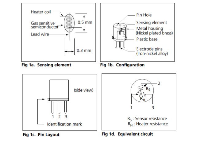氣體感應半導體材料是小珠子的類型,加熱線圈和電極線嵌入在元件中。敏感元件安裝在有5個可以通氣的小孔的金屬盒內(Fig1) 。