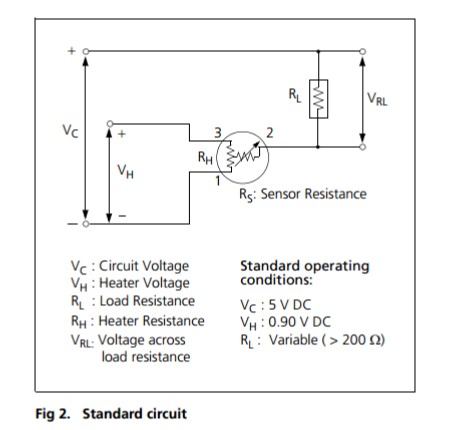 Fig2展示了此產(chǎn)品的標(biāo)準(zhǔn)使用電路。傳感器阻值(Rs)的變化導(dǎo)致了負(fù)載電阻(RL)上的電壓的變化。為了獲取適宜的性能和參數(shù),加熱電壓(VH),電路電壓(Vc)和負(fù)載電阻(RL)的值必須在給定的標(biāo)準(zhǔn)操作條件下的值,具體參數(shù)表在下一頁表述。