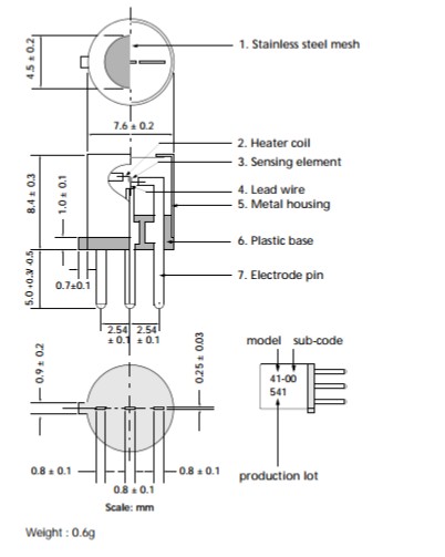 氣體感應(yīng)半導(dǎo)體材料是小珠子的類型,加熱線圈和電極線嵌入在元件中。敏感元件安裝在金屬封裝內(nèi),此封裝是用可以空氣流通的雙不銹鋼網(wǎng)眼制成。此網(wǎng)眼具有防爆特性(Fig1)。