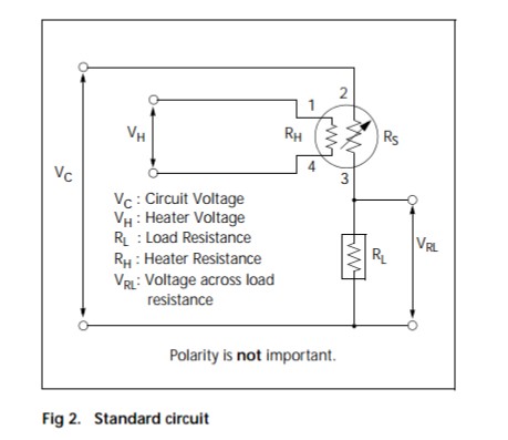 Fig2展示了此產(chǎn)品的標(biāo)準(zhǔn)使用電路。傳感器阻值(Rs)的變化導(dǎo)致了負(fù)載電阻(RL)上的電壓的變化。為了獲取最佳的性能和參數(shù),加熱電壓(VH),電路電壓(Vc)和負(fù)載電阻(RL)的值必須在給定的標(biāo)準(zhǔn)操作條件下的值,具體參數(shù)表在下一頁表述。