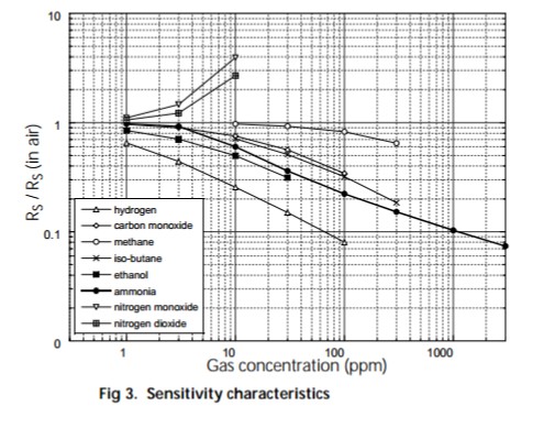 Fig3展示了SP-53B(典型數(shù)據(jù))的靈敏度參數(shù)曲線。氣體傳感器的靈敏度參數(shù)是傳感器阻值和氣體濃度的關(guān)系的體現(xiàn)。基于對數(shù)功能,傳感器阻值的減小,被測氣體濃度隨之增加。SP-53B的靈敏度參數(shù)由以下的參數(shù)詳細(xì)說明。