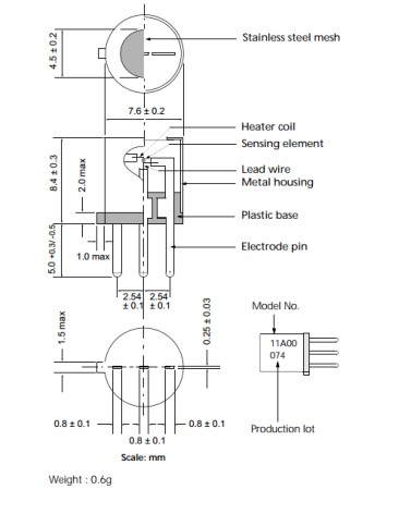 氣敏半導(dǎo)體元件呈小珠形,內(nèi)嵌加熱線圈和電極線。傳感元件安裝在金屬外殼中,其中氣流通道內(nèi)有雙層不銹鋼網(wǎng)(100 mesh)。網(wǎng)格具備防爆特性。(Fig1)