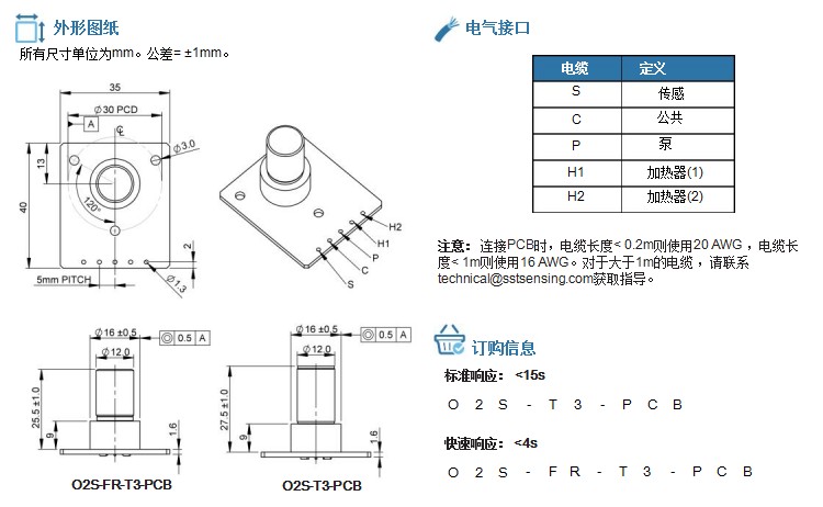 英國SST 氧化鋯傳感器 O2傳感器 PCB安裝式傳感器 O2S-T3-PCB  參數(shù):