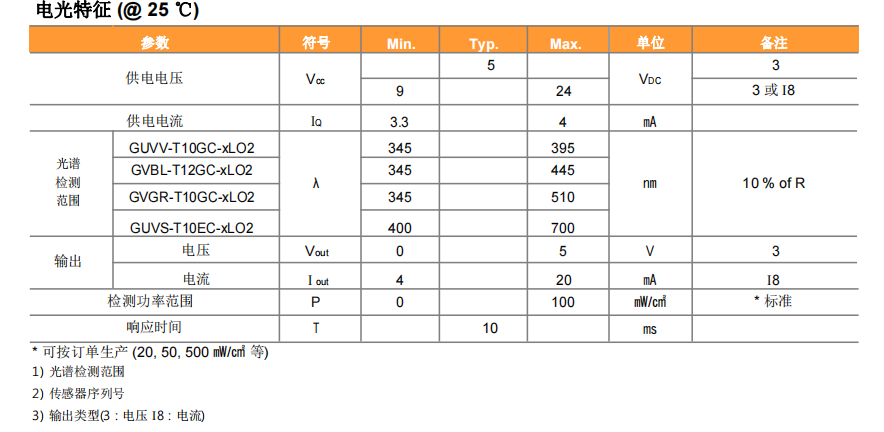 韓國GENICOM 高溫UV探頭 紫外線傳感器 UV傳感器 GUVV-T10GC-xLO2 參數(shù):