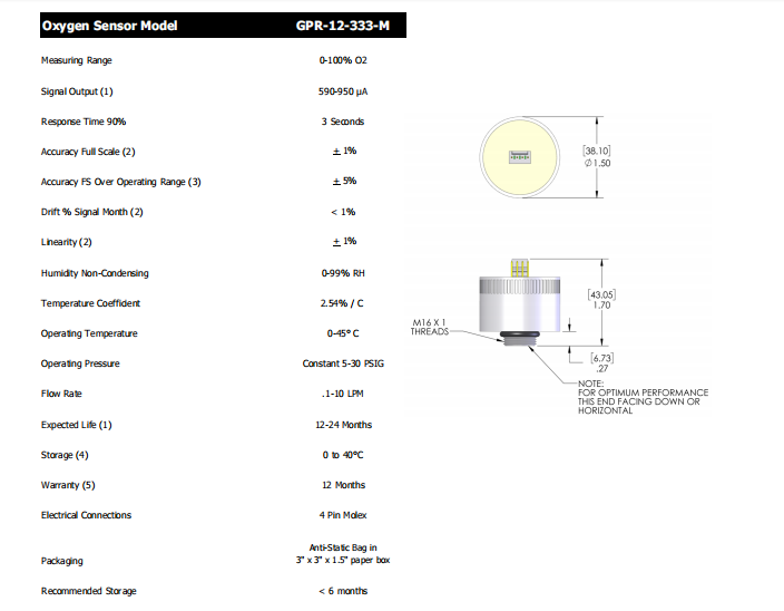 美國AII PPM O2 氧氣傳感器 微量氧傳感器?GPR-12-333-M 參數(shù):