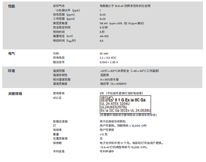 英國(guó)Alphasense VOC 光電離子傳感器 高級(jí)PID傳感器 – PIDX-A-020 參數(shù):