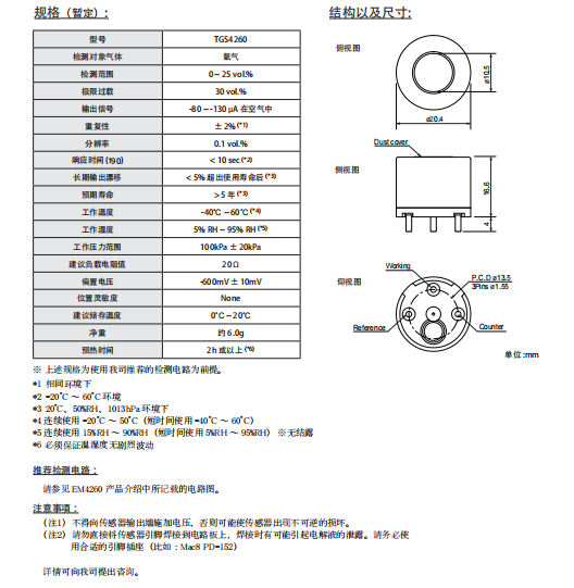 日本Figaro 恒電位電解式 無鉛氧氣傳感器 TGS4260 參數(shù):