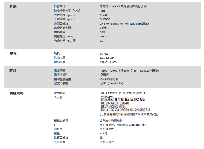 英國(guó)Alphasense VOC 光電離子傳感器 高級(jí)PID傳感器(0-10000ppm)– PIDX-A-10K參數(shù):