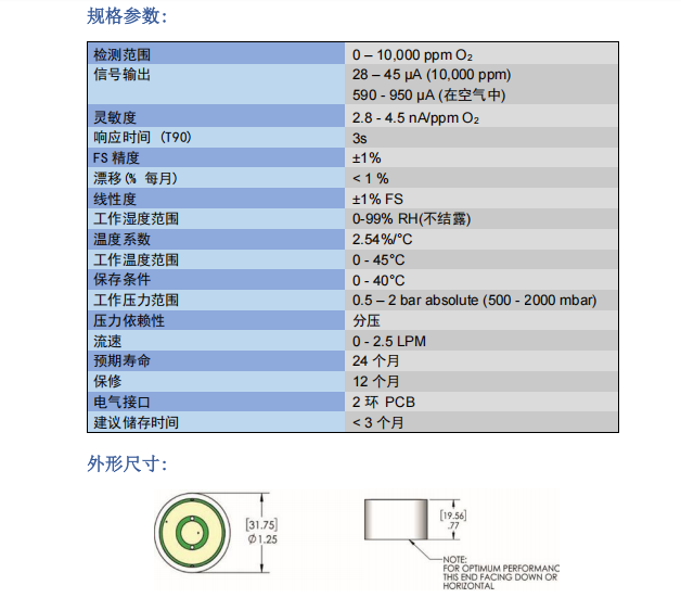 美國AII PPM級 電化學微量氧傳感器 O2 氧氣傳感器?GPR-12-333 參數(shù):
